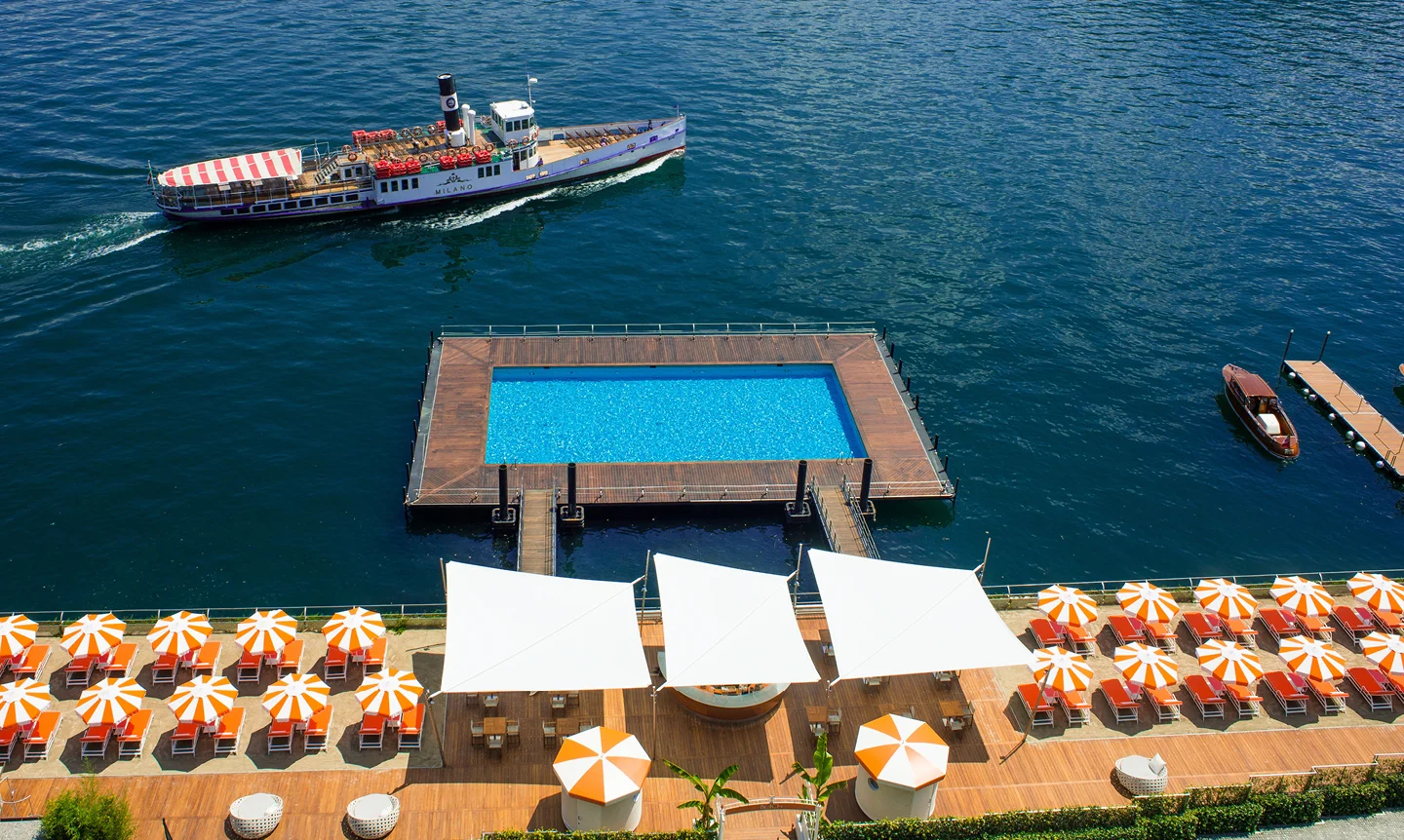 An art nouveau grand dame that stands tall but welcomes all on the western shore of Lake Como—with a direct view of the lake towards Bellagio and the Grigne Mountains—the Grand Hotel Tremezzo has over 100 years of history, from the exuberance of the Grand Tour through the early 20th century, to the modern era and its new warm and winning streak. The hotel sits amidst lush gardens with steep terraces that encompass pools, lawns, bars and areas for lounging that frame the structure in a deep rich green. Its 90-plus rooms bear all the deeply luxurious trimmings of a hotel of another era and the mod cons of tomorrow as well as a Lago location-specific dock that allows guests to navigate the lake with ease. But the most striking part is the contrast between the classic opulence of the interiors and classical façades with the bright, bouncy fun of the tangerine candy-striped umbrellas and the aquamarine pontoon pool beyond.