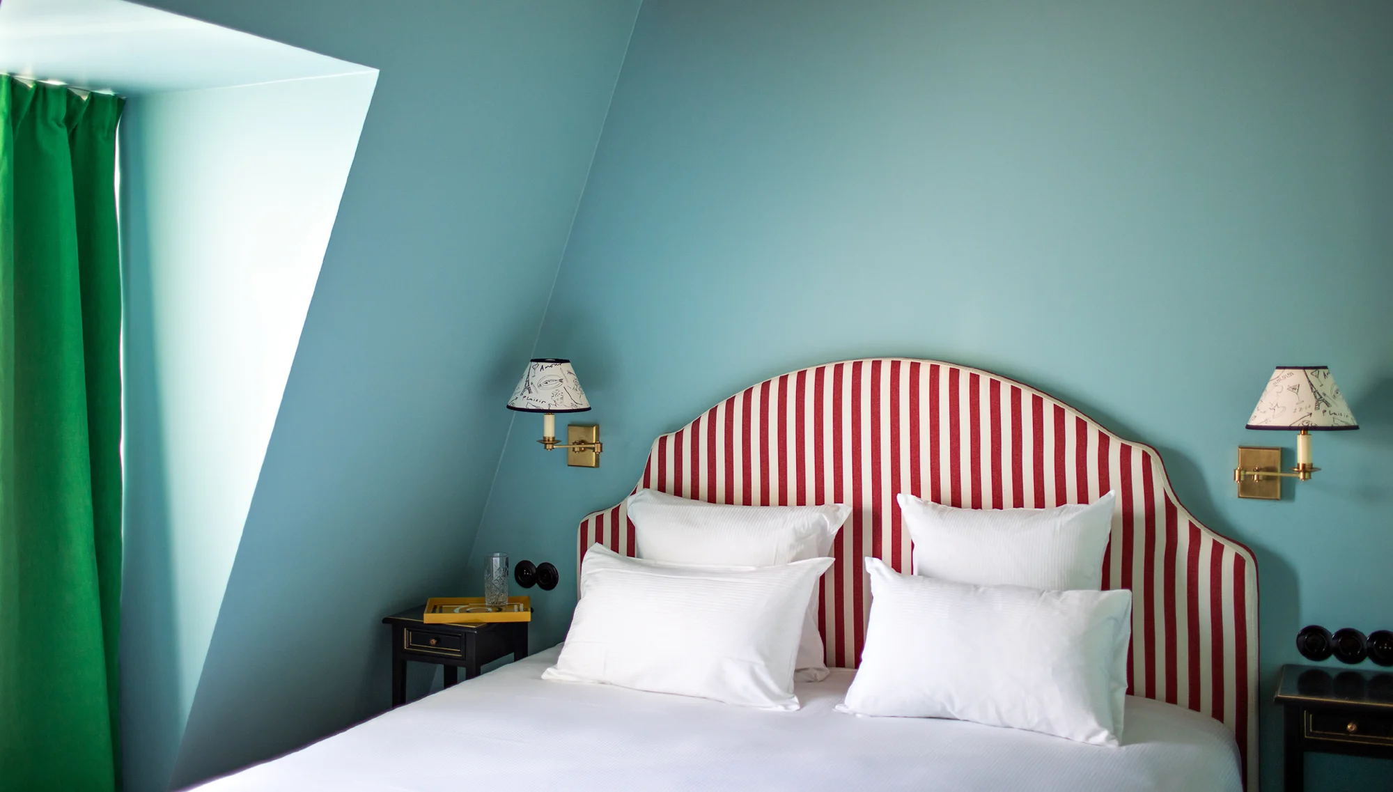 Hall also brought his signature vivid palette and romantic’s magpie eye to the interiors. From the outside, it looks like the kind of modest, four-story hotel you see from your window when pulling into the gare. (In this case the Gare de l’Est in Paris’ trendy 10th arrondissement; the other gare referenced in the name is the Gare du Nord, which lies across the rue la Fayette.) Inside, however, that classic French/Art Deco feel has been amplified and modernized by Hall’s three shocking color palettes — one per floor. “There’s not a white wall in the building!” marvels Gloaguen. “Not even on the ceiling! At first it scared us a little. En France, ça n’existe pas!” But the chartreuse green, electric lemon and bubble-gum rose of the walls and square-tiled bathrooms work, well, brilliantly, especially when contrasted against equally outgoing striped headboards and velvet settees. The light that flows in thanks to the unobstructed views over the station make it lovelier still.