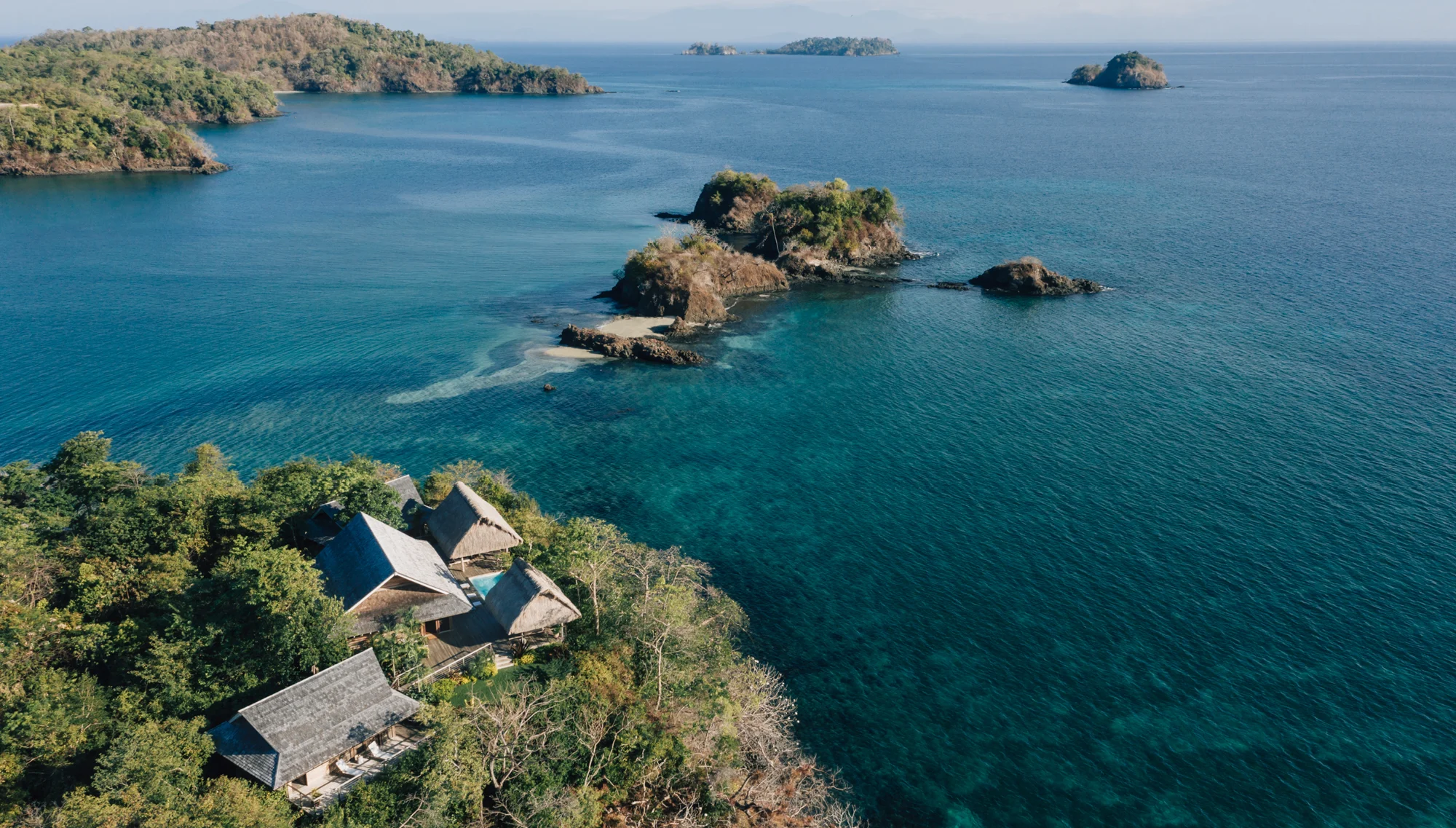 After big planes, tiny planes, driving through villages of colorful houses with thatched roofs, climbing onto the nose of a small boat, and shifting through a mist of clouds (a mountain cumulus poetically referred to by locals as the “cloud forest”), we reached the Archipelago de Islas Secas. We were barefoot by the time we arrived at the smattering of eight isolated residences, so artfully simplistic and made with such natural materials they seem almost an extension of the main island, Isla Cavada, itself.